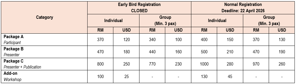 If you are registering for Package B or Package C, please click the corresponding link for registration and abstract submission. The Secretariat will email the registrant to confirm acceptance of the abstract and provide details of the payment process.